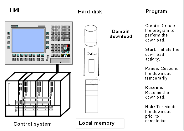 A DomainDownload Program Invocation can be created and also destroyed by a Client. The Program Invocation will not delete itself when halted, but will persist until explicitly removed by the Client. A DomainDownload Program Invocation cannot be reset to restart. The Server will support up to 500 concurrent DomainDownload Program Invocations.