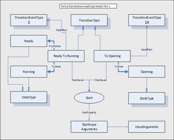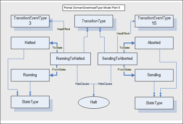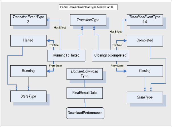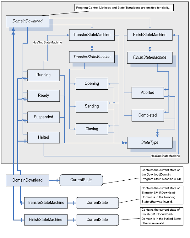 Figure A.3 presents a partial DomainDownloadType model that illustrates the association between the states and the DomainDownload, Transfer, and Finish State Machines. Note that the current state number for the sub State Machines is only valid when the DomainDownload active base state references the sub State Machine, Running for the Transfer current state and Halted for the Finish current state.