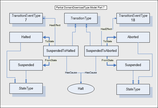 Figure A.9 illustrates the model for the Suspended To Halted state transition for an abnormal termination of the domain download. The cause for this transition is the Halt Method. The Client can terminate the download of domain data to the control while it is suspended. The transition from SuspendedToHalted invokes the Event notifiers for TransitionEventTypes 7 and 18.