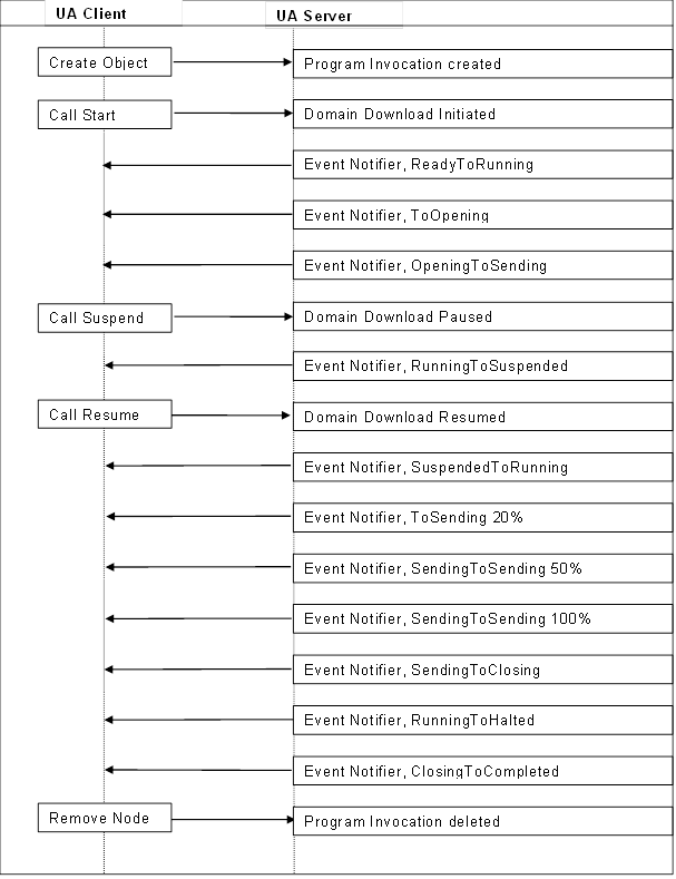 Notice that a state transition can initiate and terminate at the same state (Sending). In this case the transition serves a purpose. The ProgramTransitionEventType effect referenced by the SendingToSending state transition has an IntermediateResultData Object Reference. The IntermediateResultData Object serves to identify two Variables whose values are obtained each time the state transition occurs. The values are sent to the Client with the Event notification. Table A.11 defines the IntermediateResults ObjectType and Table A.12 defines the Variables of the ObjectType.