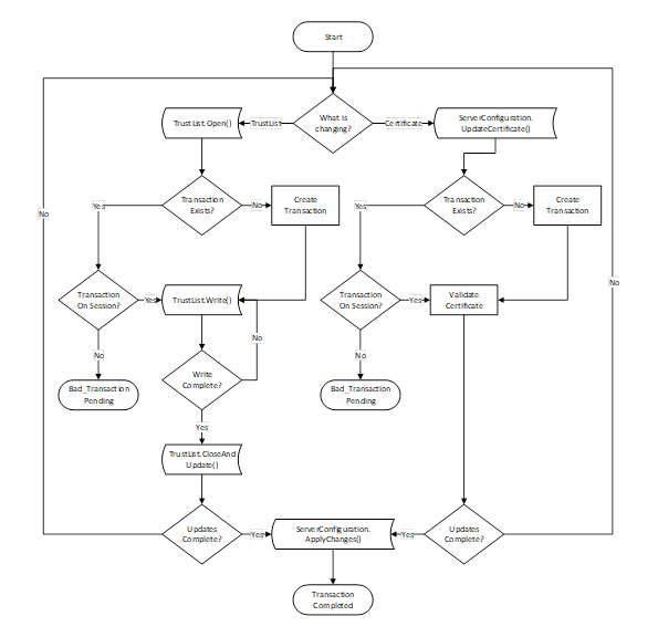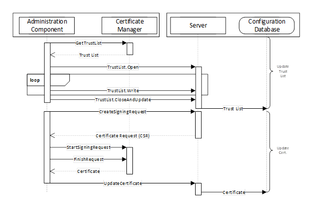 Subsequent updates to TrustLists or Certificates can be allowed if the Client has a trusted Certificate and has access to the SecurityAdmin Role. During the setup state the Client shall configure the SecurityAdmin Role. If the Client fails to do this Server shall stay in application setup state.