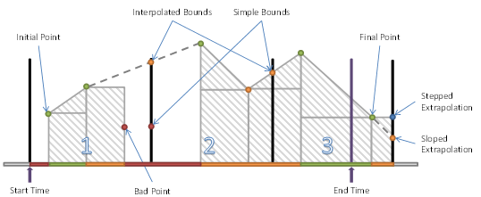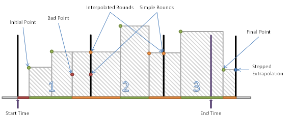 The DurationBad Aggregate defined in Table 43 divides the interval into regions of Bad and non-Bad data. Each region starts with a data point in the interval. If that data point is Bad the region is Bad. The Aggregate is the sum of the duration of all Bad regions expressed in milliseconds.