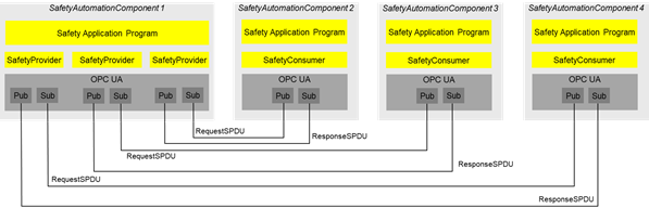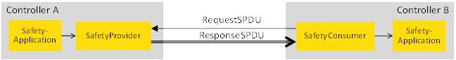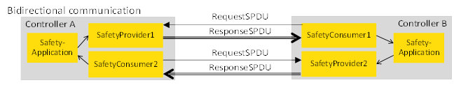 Bidirectional communication means the exchange of data in both directions, which is accomplished by placing a SafetyProvider and a SafetyConsumer on each controller. Hence, bidirectional communication is realized using two safety connections according to this document. See Figure B.2 for an example.