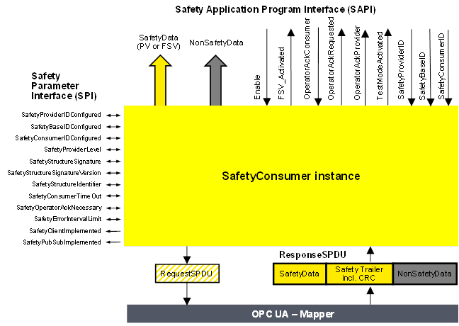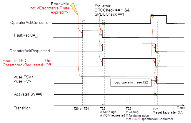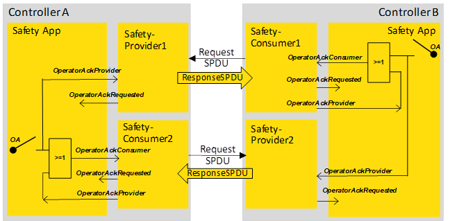 This document supports operator acknowledgment both on the SafetyProvider side and on the SafetyConsumer side. For this purpose, both the interface of the SafetyProvider and the SafetyConsumer comprise a Boolean input called OperatorAckProvider and OperatorAckConsumer, respectively. The safety application can get the values of these parameters on the consumer side via the Boolean outputs OperatorAckRequested and OperatorAckProvider on the SafetyConsumers SAPI (see 6.3.4.2).