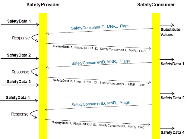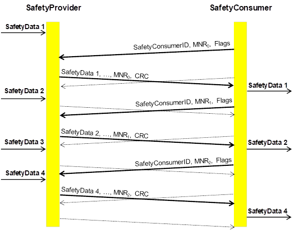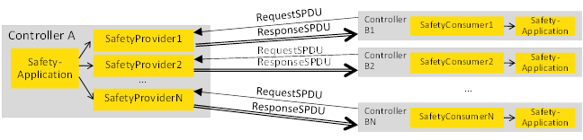 This is accomplished by placing a SafetyProvider on Controller A and a SafetyConsumer on Controller B. The connection between SafetyProvider and SafetyConsumer can be established and terminated during runtime, allowing different consumers to connect to the same SafetyProvider at different times. Furthermore, the protocol is designed in such a way, that it is necessary for the SafetyConsumer to know the parametrized set of IDs of the SafetyProvider such that it is able to safely check whether the received data is coming from the expected source. On the other hand, as SafetyData flows in one direction only, it is not necessary for the SafetyProvider to check the ID of the SafetyConsumers. Hence, Controller A can one after another serve an arbitrarily large number of SafetyConsumers, and new SafetyConsumers can be introduced into the system without having to update Controller A.