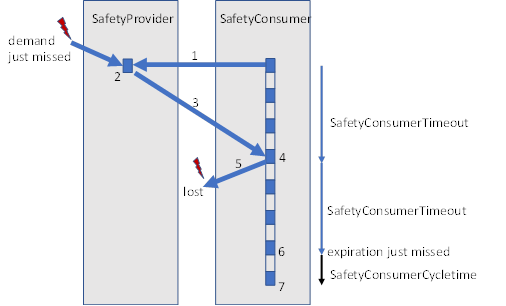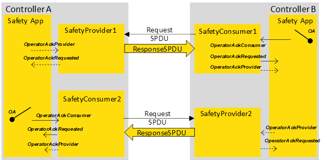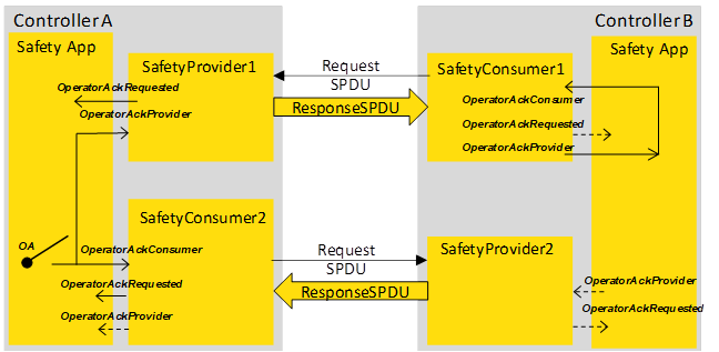 In the scenario shown in Figure B.4, operator acknowledgment is done on the SafetyConsumer side, operator acknowledgment on the SafetyProvider side is not possible.